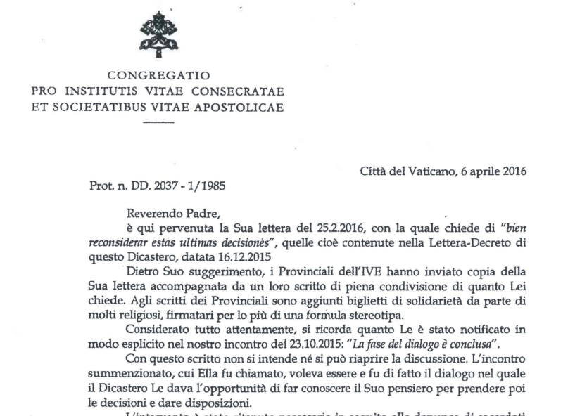 Considerado todo atentamente, se recuerda cuanto le fue notificado explícitamente en nuestro encuentro del 23.10.2015: “La fase del diálogo ha concluido”. Con este escrito no se pretende ni se puede reabrir la discusión. El encuentro mencionado, al cual usted fue convocado, quería ser —y de hecho fue— el diálogo en el cual el Dicasterio le daba la oportunidad de hacer conocer su pensamiento para luego tomar las decisiones y dar las disposiciones.